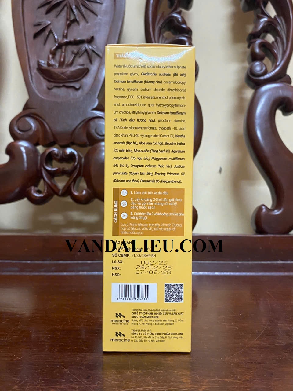 Nước (Nước tinh khiết), sodium lauryl ete sunfat, propylene glycol, Gleditschia australis (Bồ kết), Ocimum tenuiflorum (Hương nhu), cocamidopropyl betain, glycerin, natri clorua, dimethiconol, fragrance, PEG-150 Distearate, menthol, phenoxyetanol, amodi-methicon, guar hydroxypropyltrimonium chloride, ethylhexylglycerin, Ocimum tenuiflorum oil (Tinh dầu hương nhu), piroctone olamine, TEA-Dodecylbenzenesulfonate, trideceth -10, acid citric khan, PEG-40 Hydrogenated Caster Oil, Mentha arvensis (Bạc hà), Aloe vera (Lô hội), Eleusine indica (Cò mần trầu), Morus alba (Tang bạch bì), Ageratum conyzoides (Cỏ ngũ sắc), Polygonum multiflorum (Hà thủ ô), Oroxylum indicum (Núc nác), Justicia paniculata (Xuyên tâm liên), Evening Primrose Oil (Dâu hoa anh thảo), Provitamin B5 (Dexpanthenol).