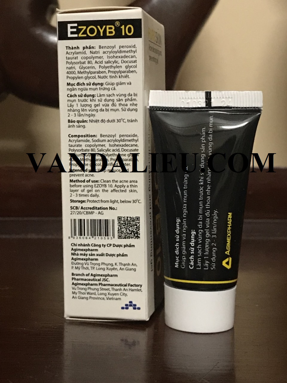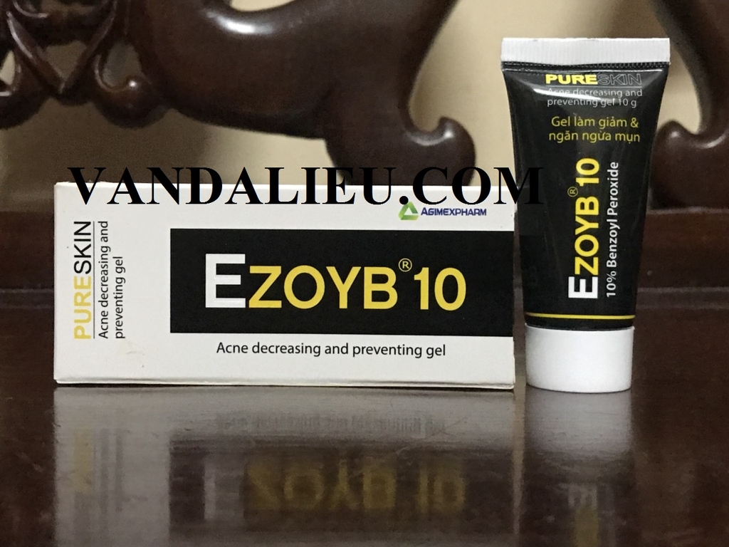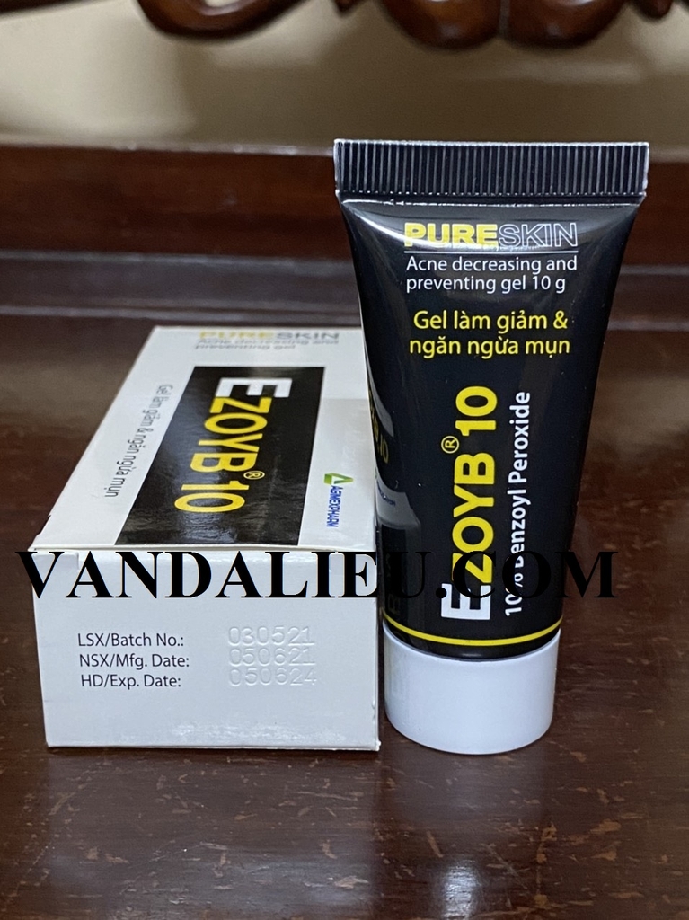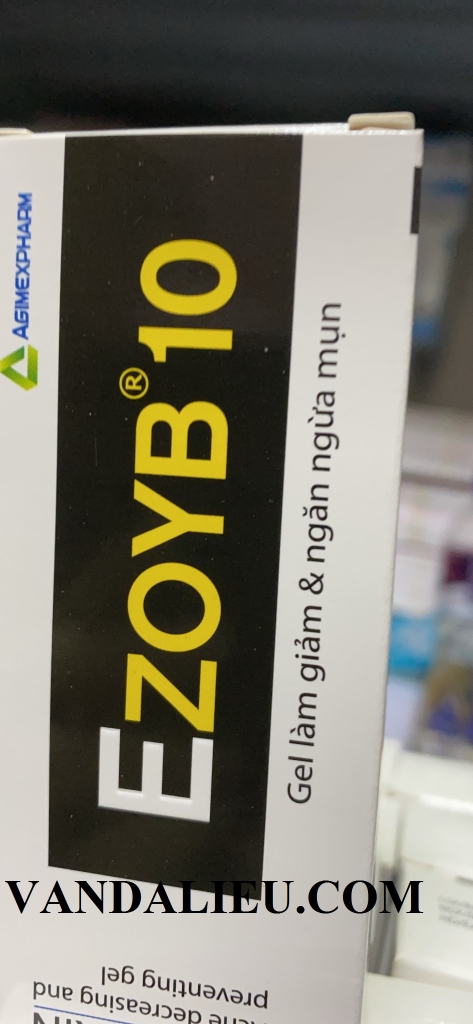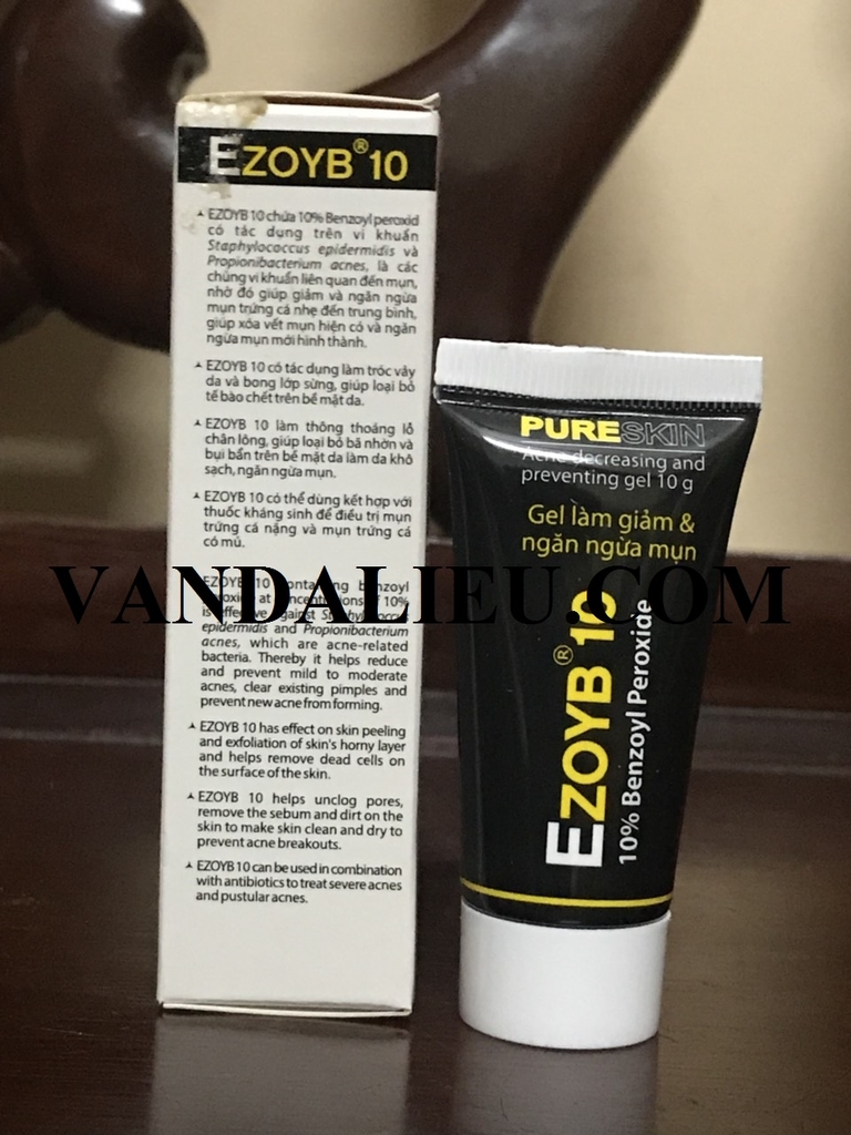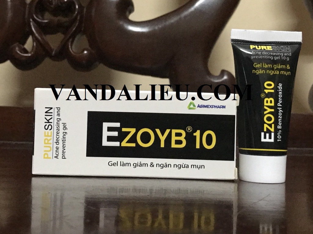 Với thành phần: Benzoyl peroxid, Carbopol 940, Propylen glycol, Cremophor RH40, Povidon K30, Trithanolamin, Nước tinh khiết. Ezoyb 10 chứa 10% Benzoyl peroxid có tác dụng trên vi khuẩn Staphylococcus epidermidis và Propionibacterium acnes, là các chủng vi khuẩn liên quan đến mụn, nhờ đó giúp giảm và ngăn ngừa mụn trứng cá nhẹ đến trung bình, giúp xóa vết mụn hiện có và ngăn ngừa mụn mới hình thành. Ezoyb 10 có tác dụng làm tróc vảy da và bong lớp sừng, giúp loại bỏ tế bào chết trên bề mặt da. Ezoyb 10 làm thông thoáng lỗ chân lông, giúp loại bỏ bã nhờn và bụi bẩn trên bề mặt da làm da khô sạch, ngăn ngừa mụn. Ezoyb 10 có thể dùng kết hợp với thuốc kháng sinh để điều trị mụn trứng cá nặng và mụn trứng cá có mủ. , Tránh ánh sáng. Xuất xứ: Việt Nam