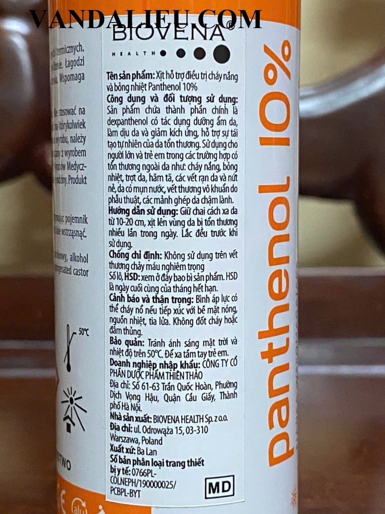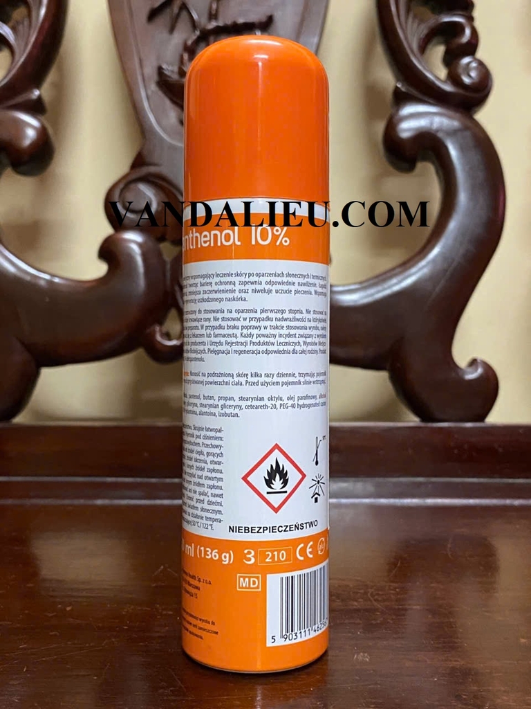 Xịt cháy nắng và bỏng nhiệt Panthenol 10% với hoạt chất chính là Dexpanthenol. Được sử dụng trong các trường hợp cháy nắng, bỏng nhiệt, trợt da, hăm tã, các vết rạn da và nứt nẻ, da có mụn nước, vết thương vô khuẩn do phẫu thuật, các mảnh ghép da chậm lành.